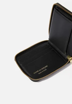 COMME DES GARÇONS CLASSIC WALLET. – MADE FROM 100% COWHIDE LEATHER- COMPARTMENTS INCLUDE THREE CARD SLOTS, COIN POUCH, AND NOTE SECTION- FINISHED WITH A GOLD ZIP AND GOLD COMME DES GARÇONS LOGO ON THE INSIDE- 11.5CM W X 10CM H X 2.5CM D