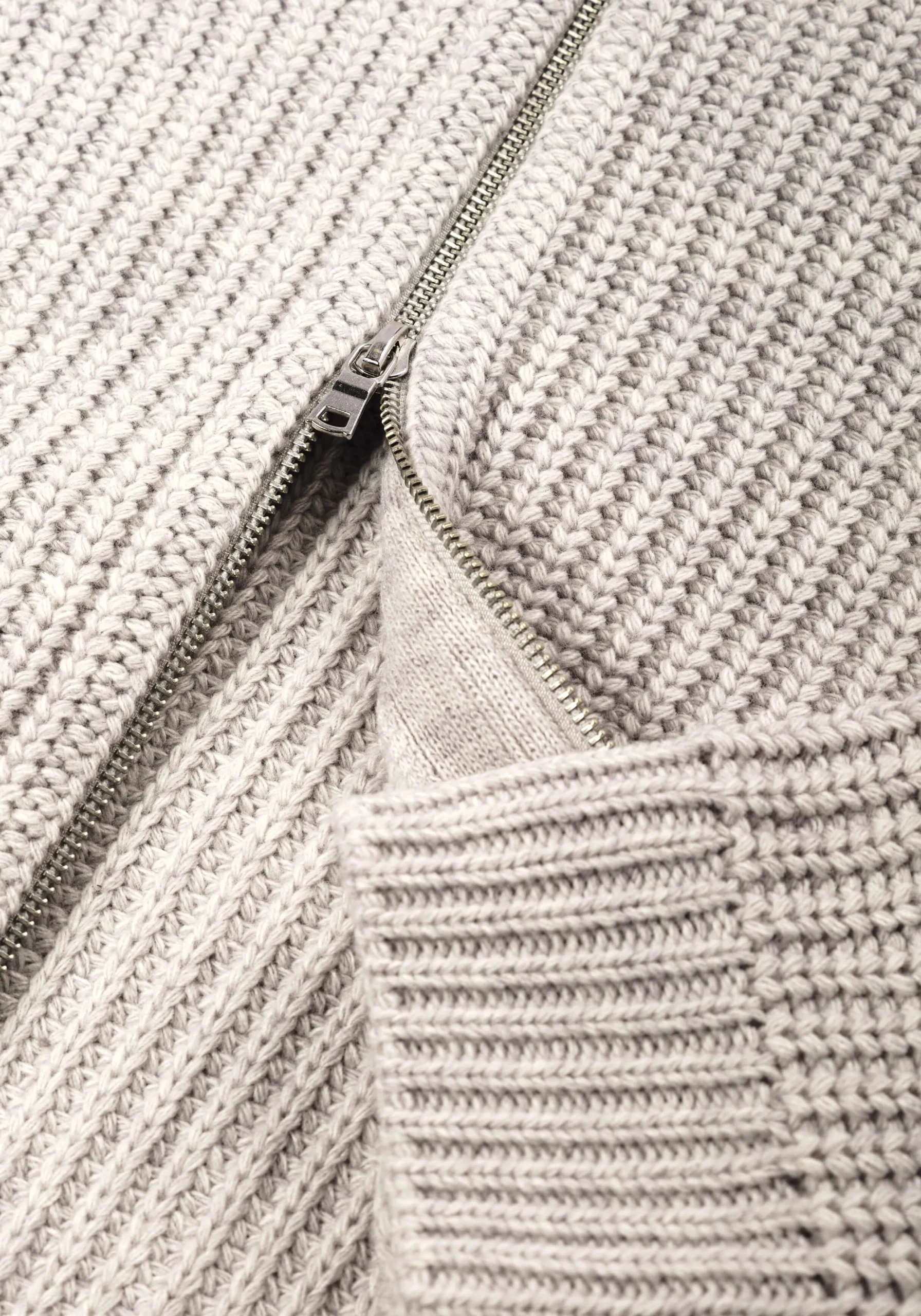 MKI Chunky Rib Knit Track Jacket in Grey features in the AW24 collection, this piece showcases minimal back embroidery and a 2-way metal zip front.