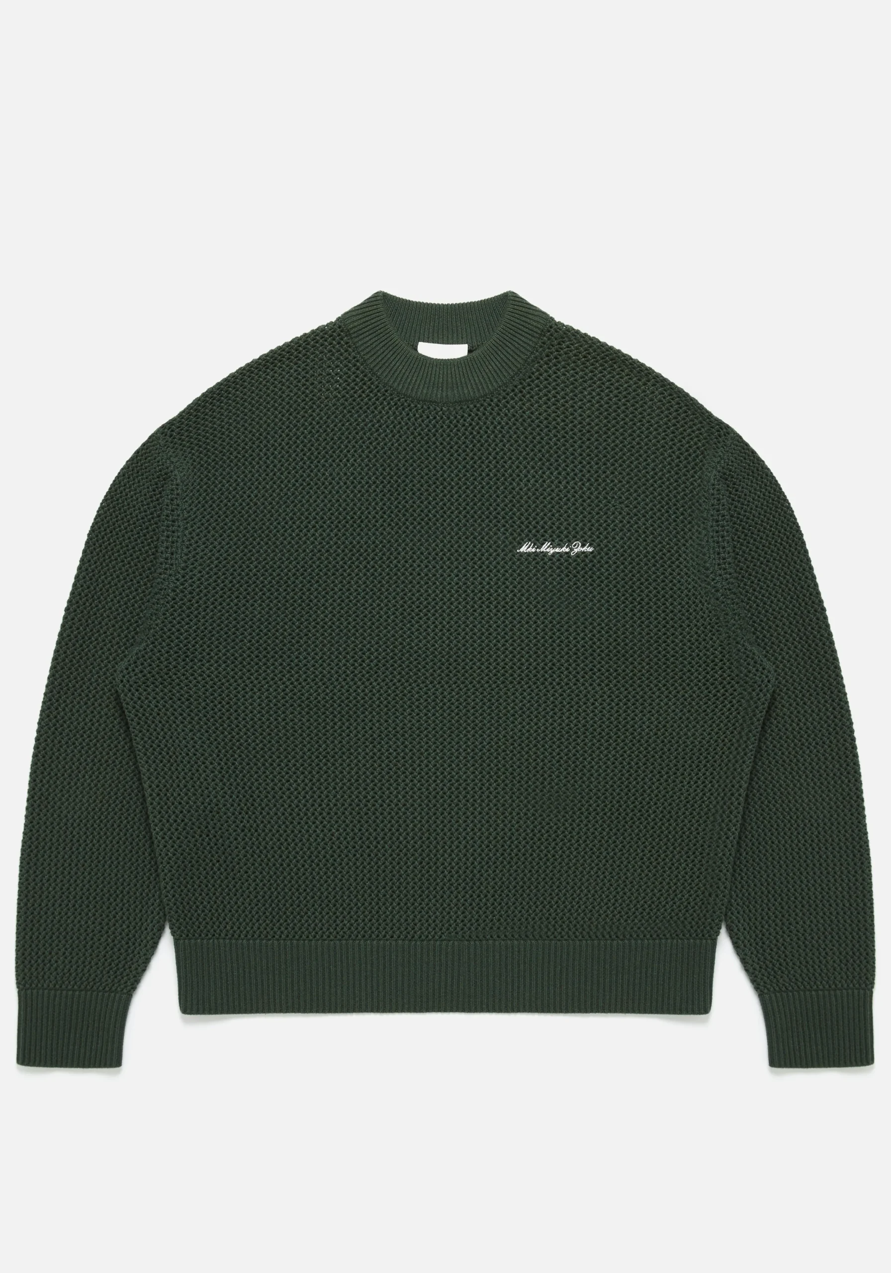 MKI LOOSE KNIT CREW IN GREEN. – 100% HEAVYWEIGHT COTTON- TIGHT CREWNECK- RIBBED COLLAR, CUFF AND HEM- DROPPED SHOULDERS- MKI EMBASSY LOGO EMBROIDERED ON FRONT CHEST THE MODEL IS 6'1 AND WEARS A SIZE LARGE.